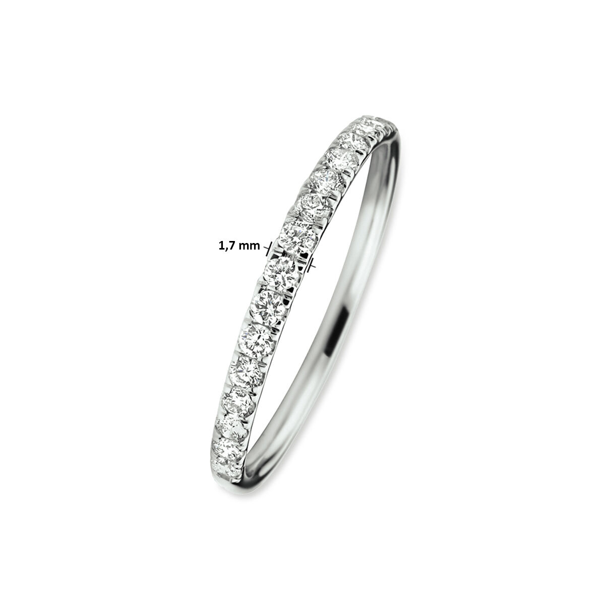 14k Witgouden ring met palladium legering. De ring is uitgevoerd met lab grown diamanten en heeft een breedte van 1.7mm. Het totale diamantgewicht is 0.255ct. Lab grown diamanten zijn diamanten die ontstaan in een laboratorium. Onder extreem hoge druk en temperatuur wordt het natuurlijk ontstaansproces nagebootst met als eindresultaat een diamant met dezelfde chemische eigenschappen maar met een andere oorsprong.