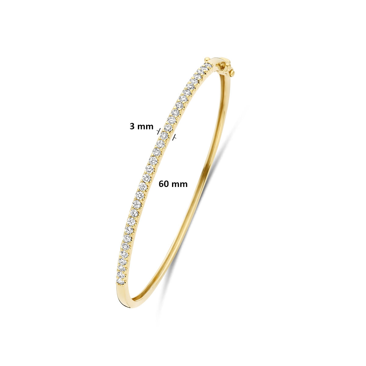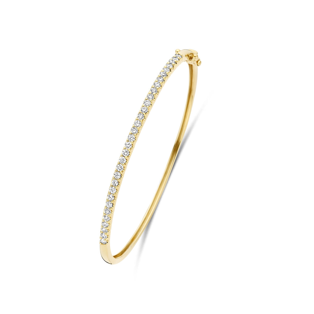 14k Geelgouden bangle uitgevoerd met lab grown diamanten. De bangle heeft een afmeting van 60x3mm. Het totale diamantgewicht is 1.00ct. Lab grown diamanten zijn diamanten die ontstaan in een laboratorium. Onder extreem hoge druk en temperatuur wordt het natuurlijk ontstaansproces nagebootst met als eindresultaat een diamant met dezelfde chemische eigenschappen maar met een andere oorsprong.