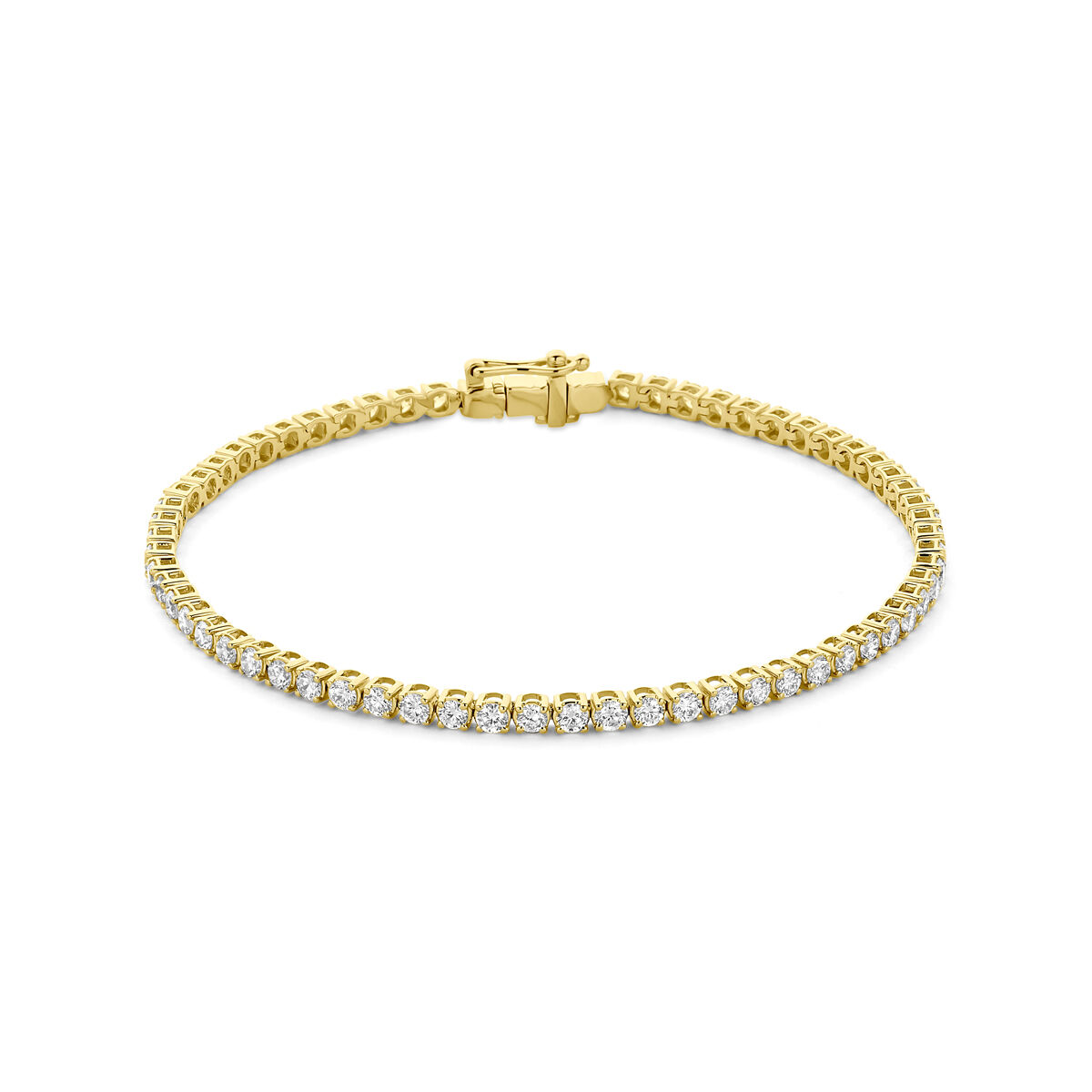 14k Geelgouden tennisarmband uitgevoerd met lab grown diamant. De armband heeft een breedte van 2.5mm en een draaglengte van 17.5cm. Het totale diamantgewicht is 3.00ct. Lab grown diamanten zijn diamanten die ontstaan in een laboratorium. Onder extreem hoge druk en temperatuur wordt het natuurlijk ontstaansproces nagebootst met als eindresultaat een diamant met dezelfde chemische eigenschappen maar met een andere oorsprong.