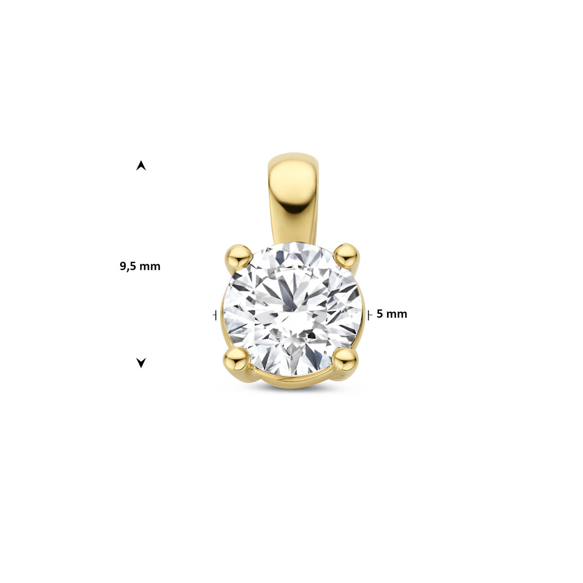 14k Geelgouden hanger uitgevoerd met lab grown diamant. De hanger heeft een hoogte van 9.5mm. Lab grown diamanten zijn diamanten die ontstaan in een laboratorium. Onder extreem hoge druk en temperatuur wordt het natuurlijk ontstaansproces nagebootst met als eindresultaat een diamant met dezelfde chemische eigenschappen maar met een andere oorsprong.