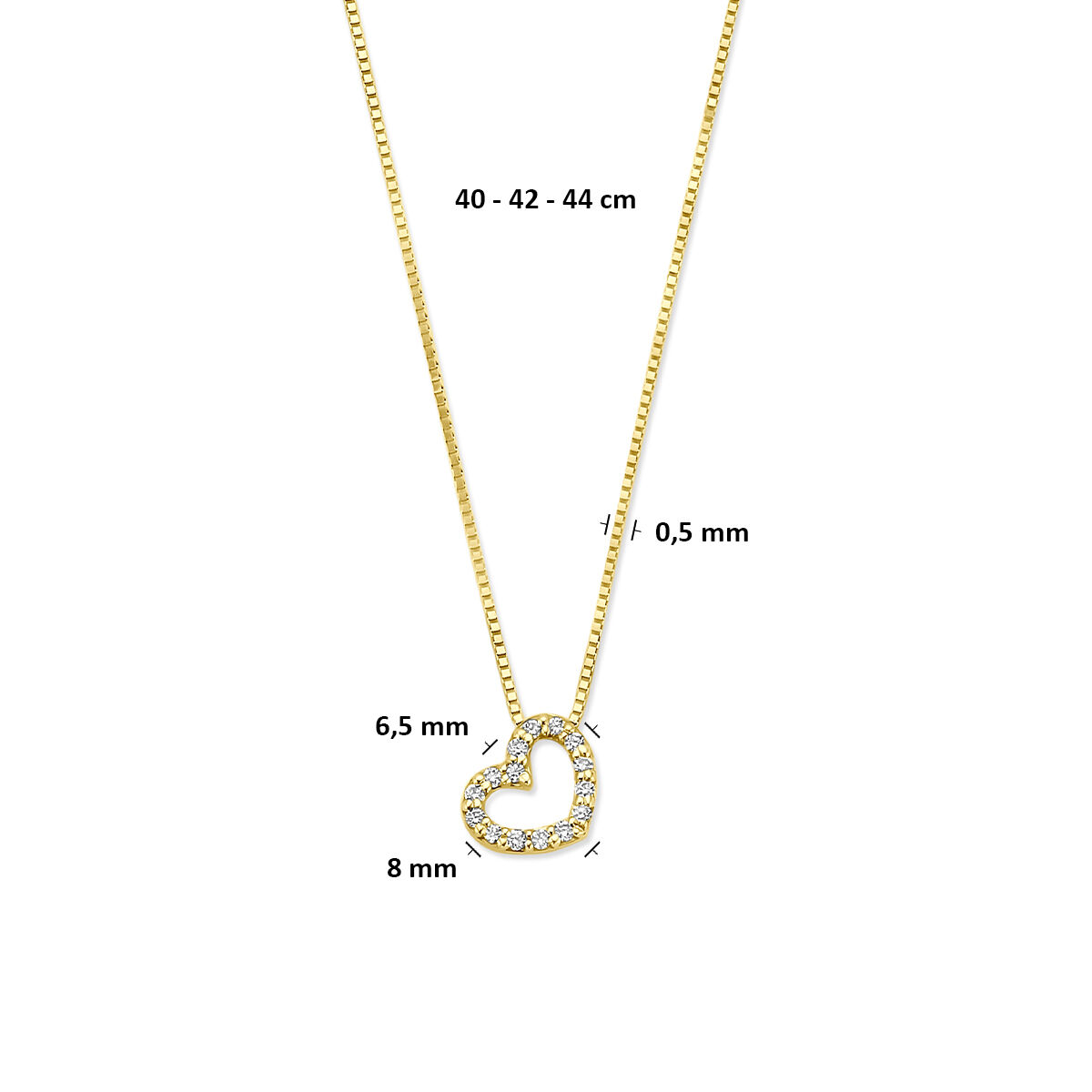 14k Geelgouden collier uitgevoerd met een hartje en lab grown diamant. Het collier heeft draaglengte van 40-42-44cm. Het totale diamantgewicht is 0.08ct.