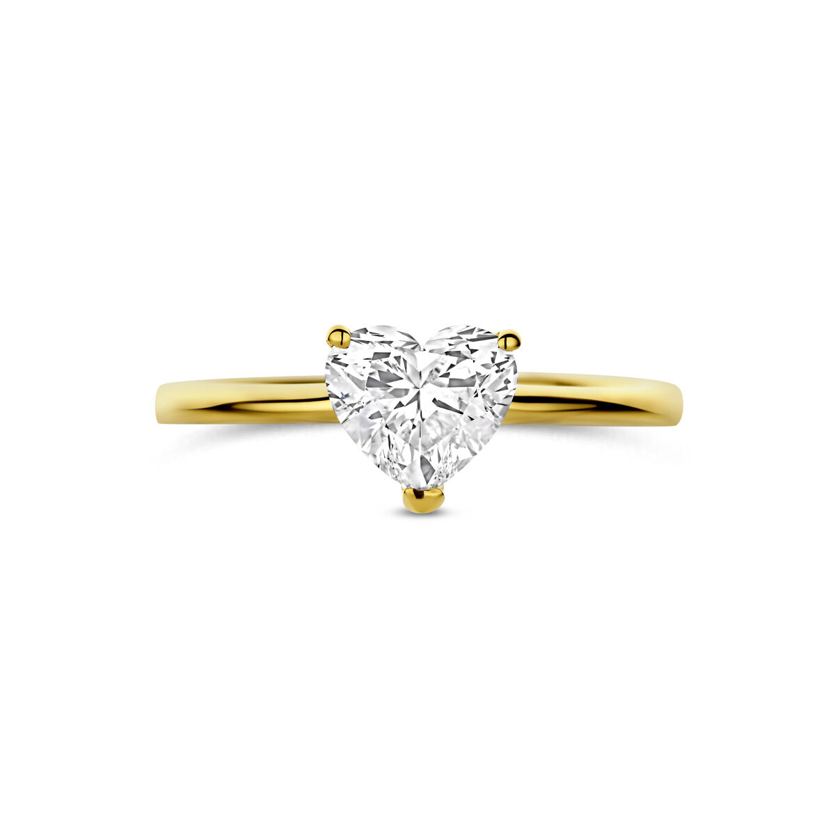 14k Geelgouden ring uitgevoerd met een hartje lab grown diamant van 7x7mm. Het totale diamantgewicht is 1.00ct. Onder extreem hoge druk en temperatuur wordt het natuurlijk ontstaansproces nagebootst met als eindresultaat een diamant met dezelfde chemische eigenschappen maar met een andere oorsprong.