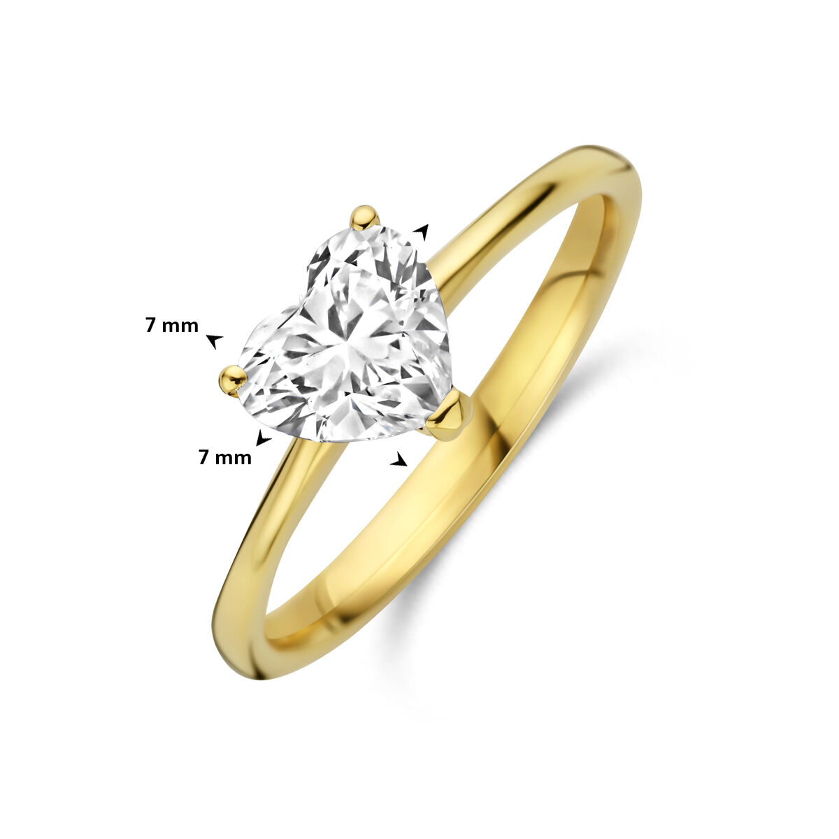 14k Geelgouden ring uitgevoerd met een hartje lab grown diamant van 7x7mm. Het totale diamantgewicht is 1.00ct. Onder extreem hoge druk en temperatuur wordt het natuurlijk ontstaansproces nagebootst met als eindresultaat een diamant met dezelfde chemische eigenschappen maar met een andere oorsprong.