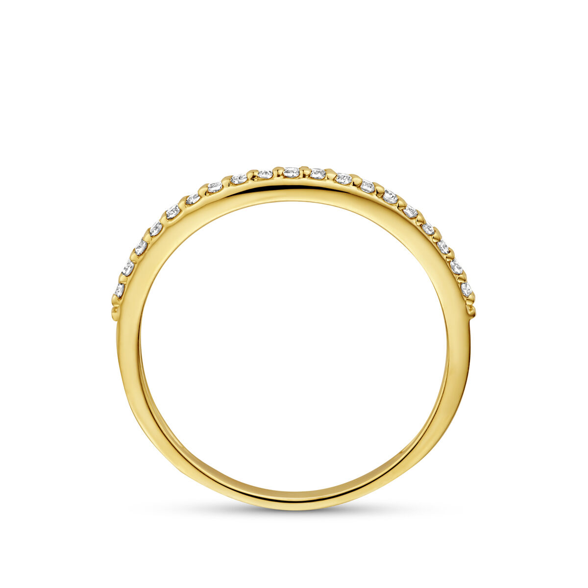 14k Geelgouden ring uitgevoerd met lab grown diamant. Het totale diamantgewicht van de ring is 0.19ct. Lab grown diamanten zijn diamanten die ontstaan in een laboratorium. Onder extreem hoge druk en temperatuur wordt het natuurlijk ontstaansproces nagebootst met als eindresultaat een diamant met dezelfde chemische eigenschappen maar met een andere oorsprong.