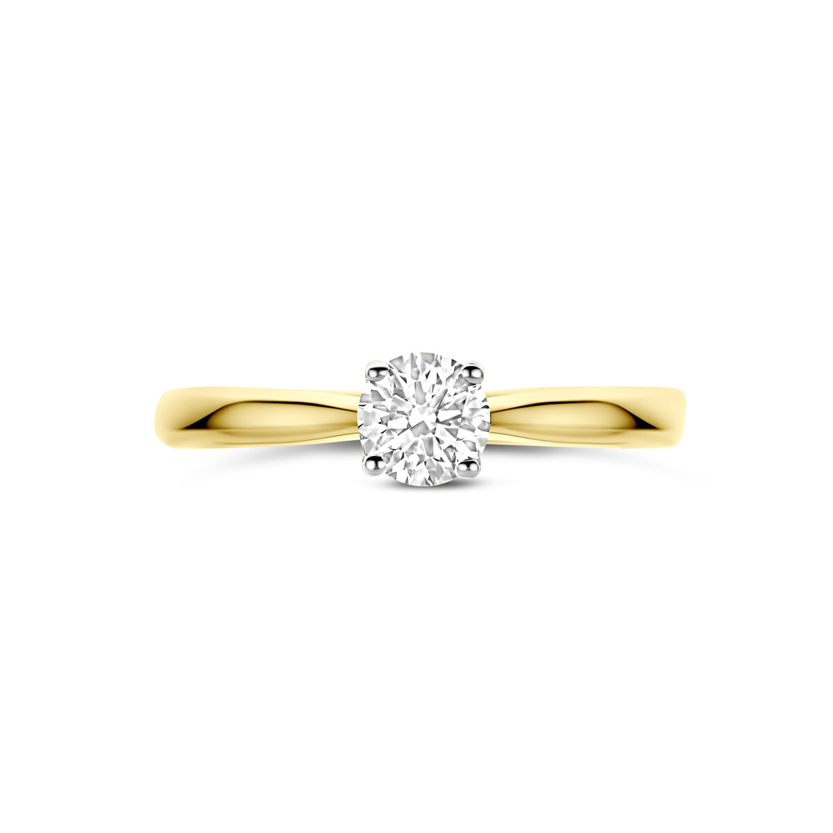 14k Bicolor geel- en witgouden ring uitgevoerd met een lab grown diamant met een totaalgewicht van 0.50ct. Lab grown diamanten zijn diamanten die ontstaan in een laboratorium. Onder extreem hoge druk en temperatuur wordt het natuurlijk ontstaansproces nagebootst met als eindresultaat een diamant met dezelfde chemische eigenschappen maar met een andere oorsprong.