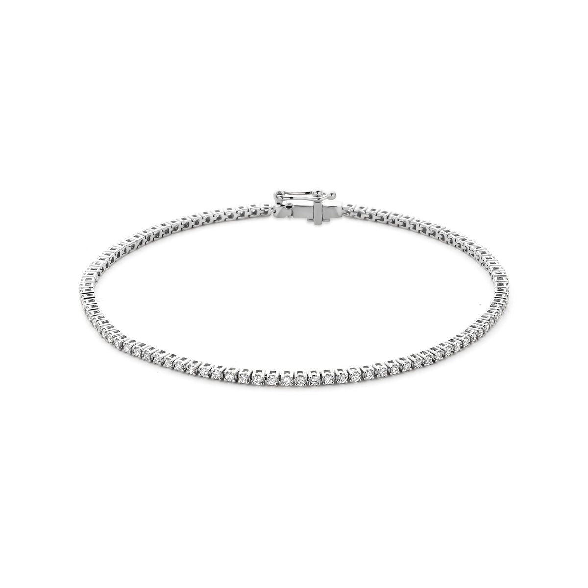 14k Witgouden tennisarmband uitgevoerd met lab grown diamant. De armband heeft een breedte van 1.7mm en een draaglengte van 17.5cm. Het totale diamantgewicht is 1.00ct. Lab grown diamanten zijn diamanten die ontstaan in een laboratorium. Onder extreem hoge druk en temperatuur wordt het natuurlijk ontstaansproces nagebootst met als eindresultaat een diamant met dezelfde chemische eigenschappen maar met een andere oorsprong.